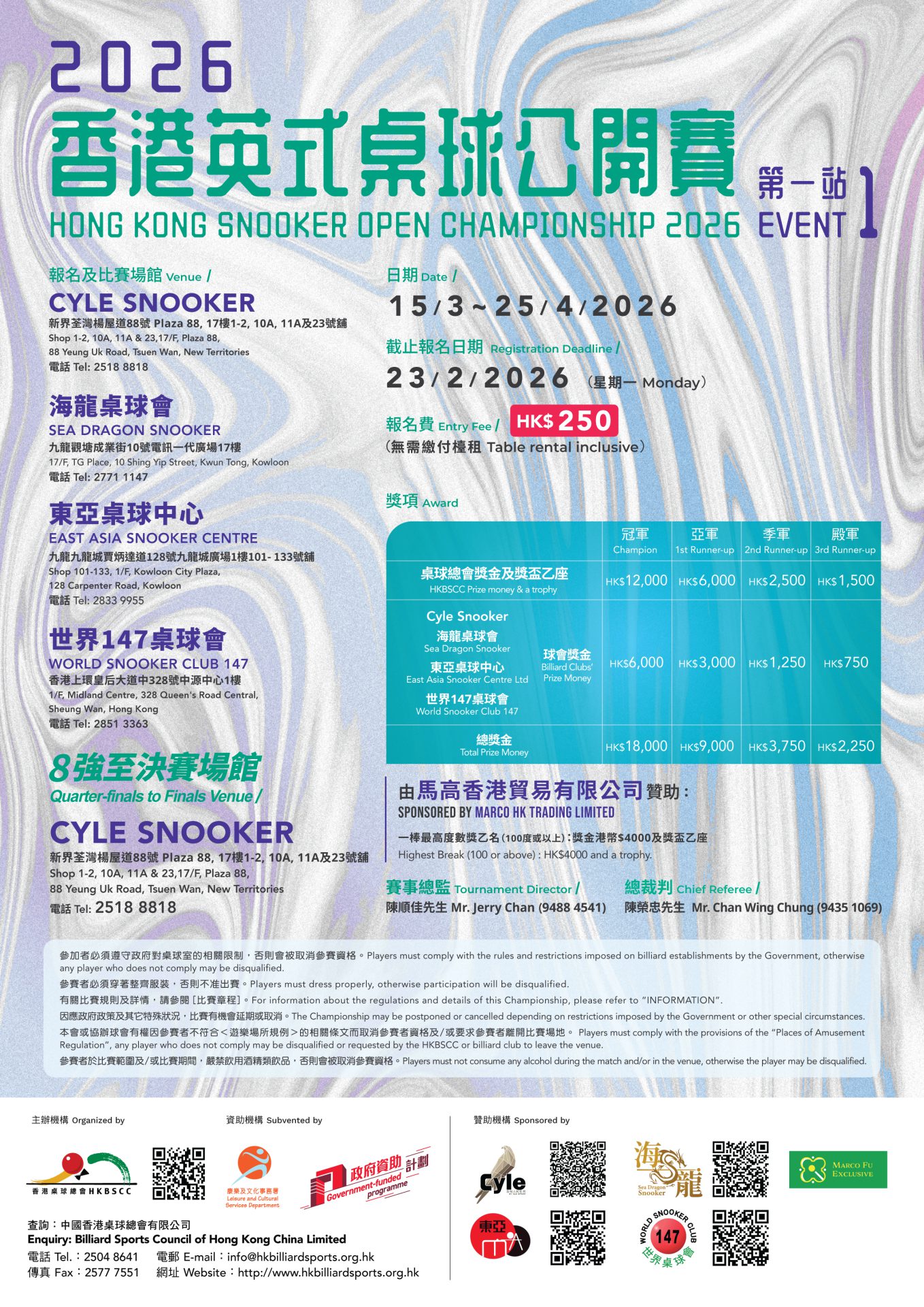 由中國香港桌球總會有限公司主辦、康樂及文化事務署資助之2026香港英式桌球公開賽-第一站將於2026年3月15日至4月25日於Cyle Snooker、海龍桌球會、東亞桌球中心及世界147桌球會正式開鑼。