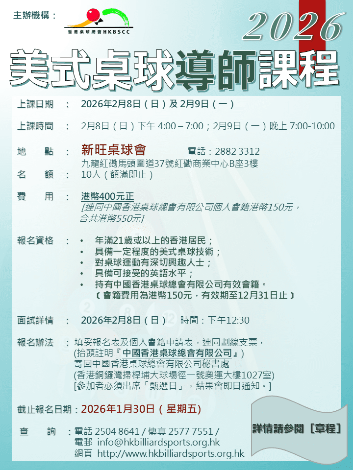 | 報名辦法: | 填妥報名表及個人會籍申請表,連同劃線支票(抬頭註明『中國香港桌球總會有限公司』),寄回中國香港桌球總會有限公司秘書處(香港銅鑼灣掃桿埔大球場徑1號奧運大樓1027室)。